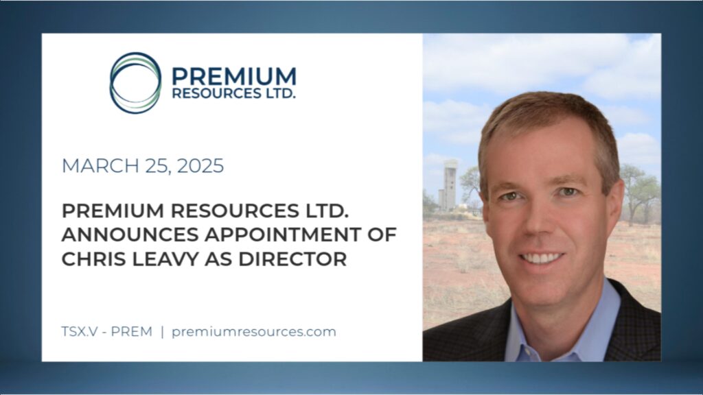 Toronto, Ontario–(Newsfile Corp. – March 25, 2025) – Premium Resources Ltd. (TSXV: PREM) (OTC Pink: PRMLF) (“PREM” or the “Company“) is pleased to announce the appointment of Mr. Chris Leavy to the Board of Directors of the Company. Mr. Leavy was appointed to the Board, effective immediately. Mr. Leavy’s appointment will fill a vacancy arising from […]