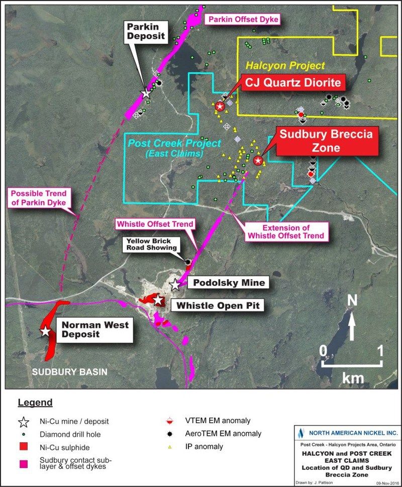 The Post Creek/Halcyon property in Sudbury is strategically located adjacent to the past producing Podolsky copper-nickel-precious metal sulphide deposit of KGHM International Ltd. The property lies along the extension of the Whistle Offset dyke structure. Such geological structures host major Ni-Cu-PGM deposits and producing mines within the Sudbury Camp.