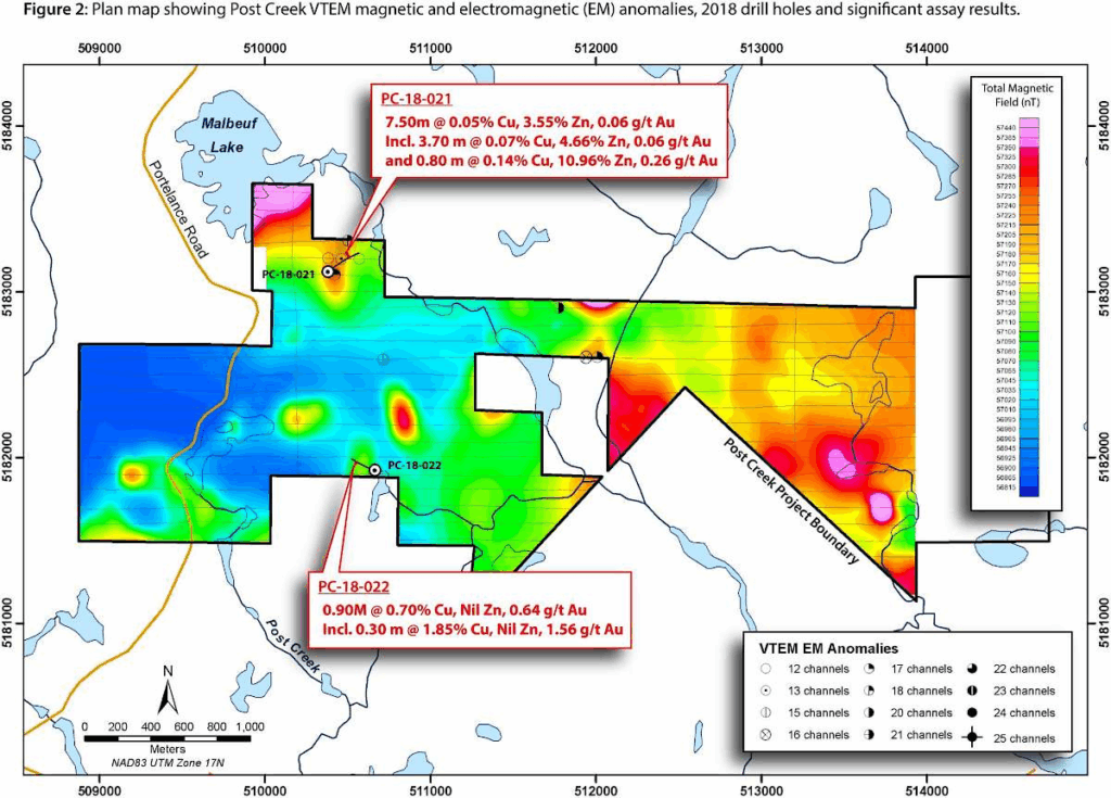 NAN CEO, Keith Morrison, commented: “Post Creek has been held as a NAN asset since 2010 because of its prospective location along the projection of the metallo genetically-significant Whistle Offset Structure. We have been exploring the project with a combination of prospecting, trenching, mapping and our recent drill program. The new discovery of previously unrecognized drill-indicated base metal massive sulphide-type copper, gold, silver and strongly-elevated zinc mineralization substantiates our focused exploration in this area. The results from the 2018 program have significantly expanded our understanding of the signature of the subsurface and the complexity of the geology on the property. These results integrated with historic data will assist us in determining the next steps in evaluating the Post Creek property.”