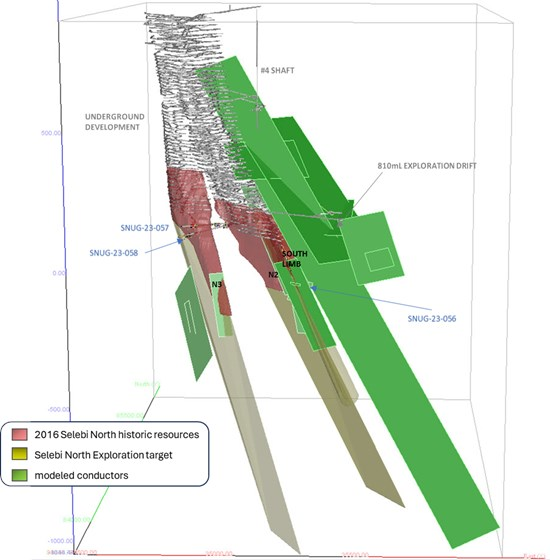 The highlighted results from SNUG-23-057 returned multiple mineralized intervals including intervals outside the historic resource estimate. SNUG-23-057 intersected mineralization corresponding to the N2 and N3 Limbs, but also intersected additional mineralization located between the N2 and N3 historic resources that is outside the historic SAMREC resource (see Figure 3). In addition, the 9.55 metre interval grading 2.72% Ni and 1.81% Cu is situated in a local fold linked to the historically mined N3 Zone in the upper levels of the mine.