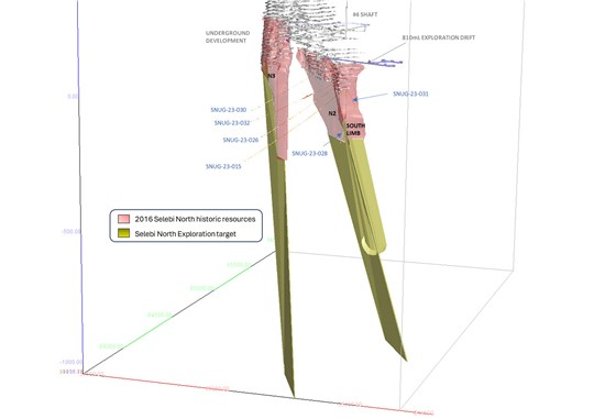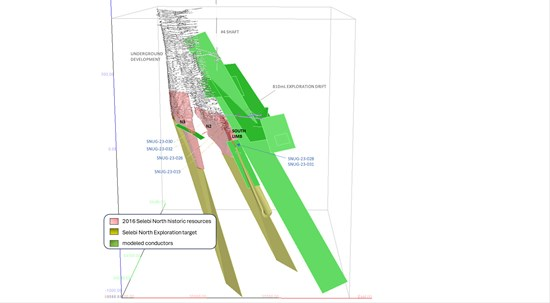 Figure 1: Selebi North: Location of Reported Drill Holes with Underground Infrastructure, Historic Resources and Exploration Targets