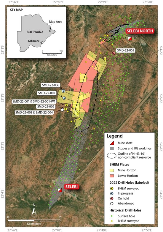 Keith Morrison, CEO, commented: “Our primary objective with this first phase of surface drilling and borehole electromagnetics (BHEM) program at Selebi is to provide the Company with the relevant information to support the transition to underground resource drilling at both the Selebi North and Selebi deposits.