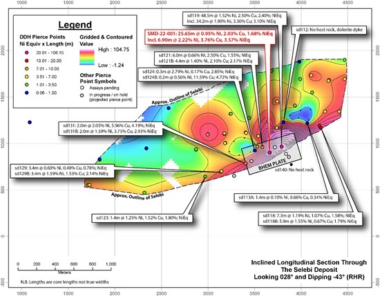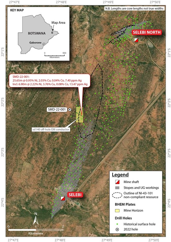 Initial drill hole SMD-22-001 was prioritized to test an off-hole borehole electromagnetic (“BHEM“) target from sd140 identified by PNRL during the compilation and verification of historic data in 2021 (figure 1). Legacy drill hole sd140 completed in 2010 was aimed at following the down-dip extension of legacy drill hole sd119 that reported an estimated true thickness interval of 38.5 metres averaging 1.58% Ni and 2.44% Cu, including 21.4 metres of 2.34% Ni and 3.39% Cu at the Selebi deposit (see news release dated August 15, 2022). Drill hole sd119 is located approximately 300 metres from the Selebi Mine underground infrastructure. See “Historic Data”.