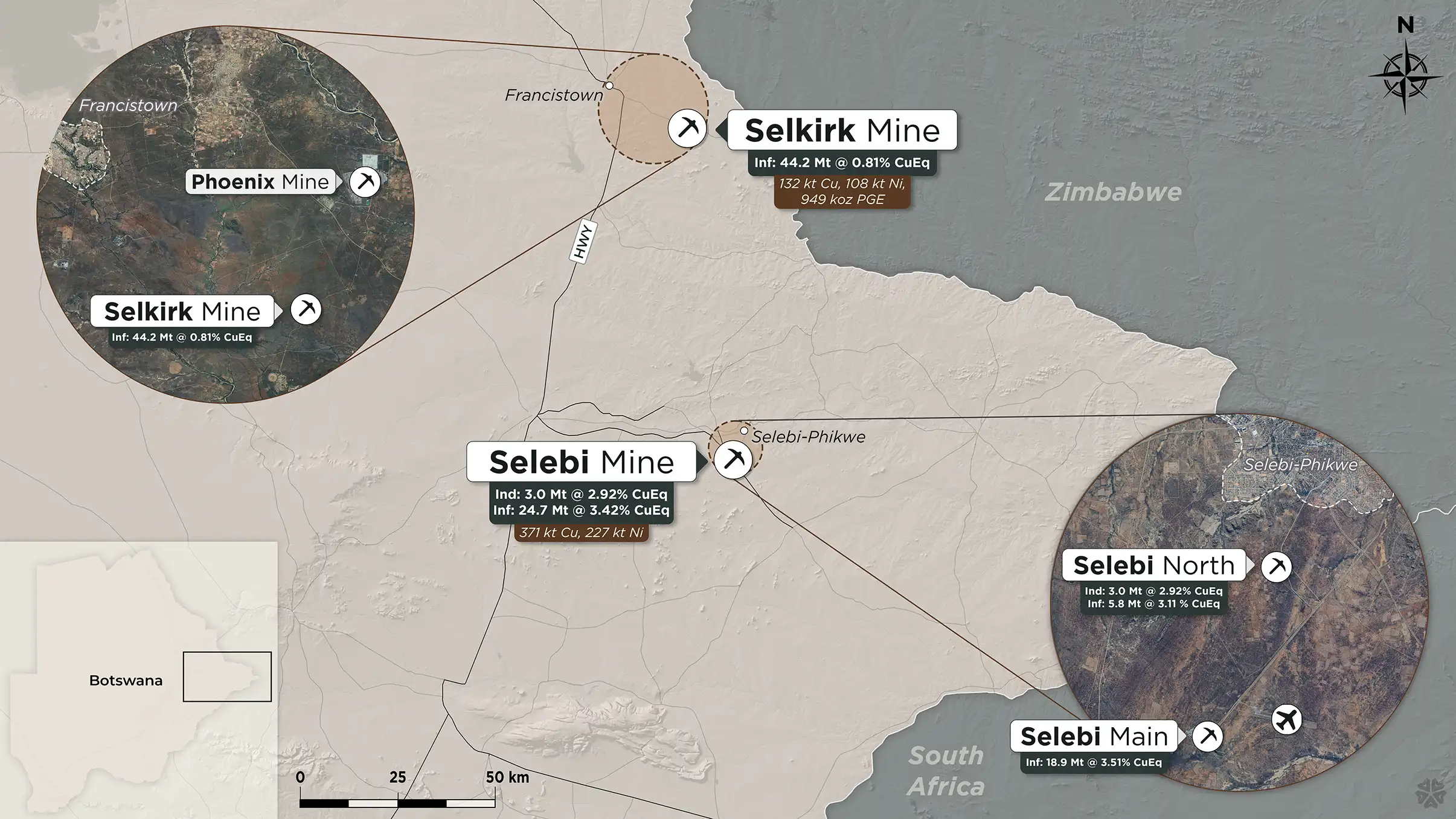 - Ongoing resampling, new drilling, and geophysics will support future MRE updates at both Selebi and Selkirk